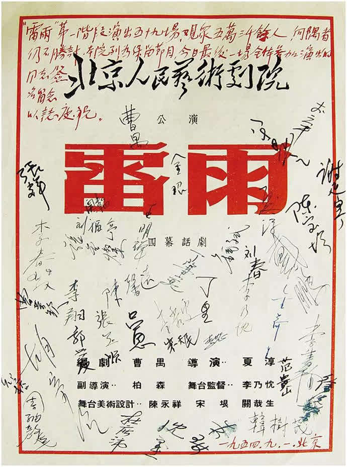 1954年,北京人艺首次演出《雷雨》。第一阶段演出59场,观众达53000余人。在此轮最后一场的演出结束后,曹禺和全体演职人员在说明书上签名留念。