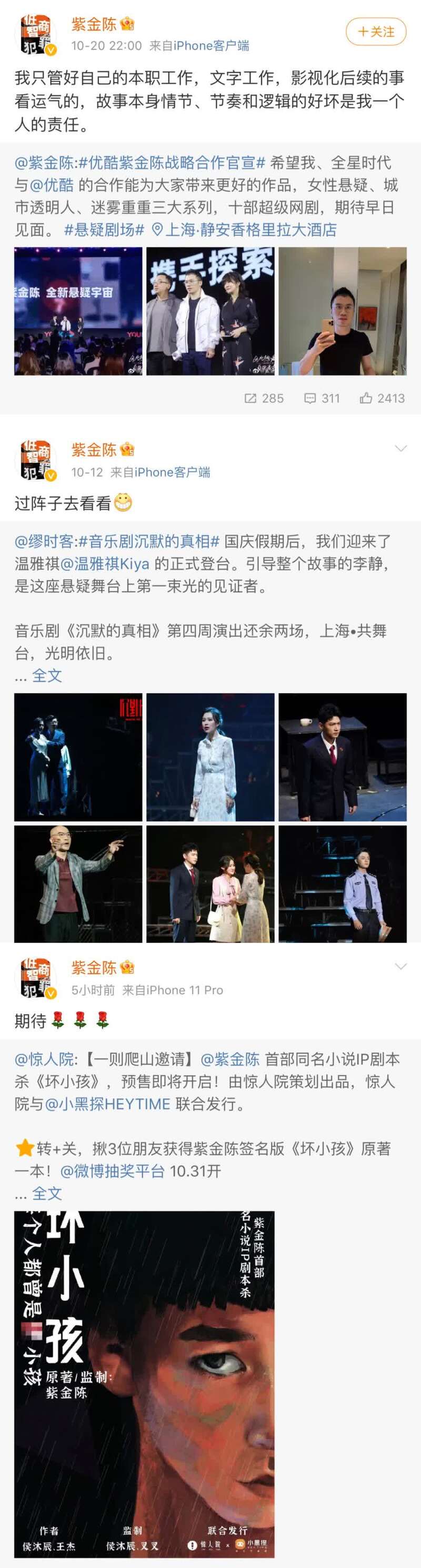 年末首演的话剧《低智商犯罪》是这部小说的第一个改编版本。紫金陈坦言,平常不太进剧院,“前段时间,张国立老师请我去看了话剧《断金》。”音乐剧《隐秘的角落》《沉默的真相》上海热演,紫金陈没时间看,但在微博与剧组保持积极互动,也吸引不少粉丝走入剧场。