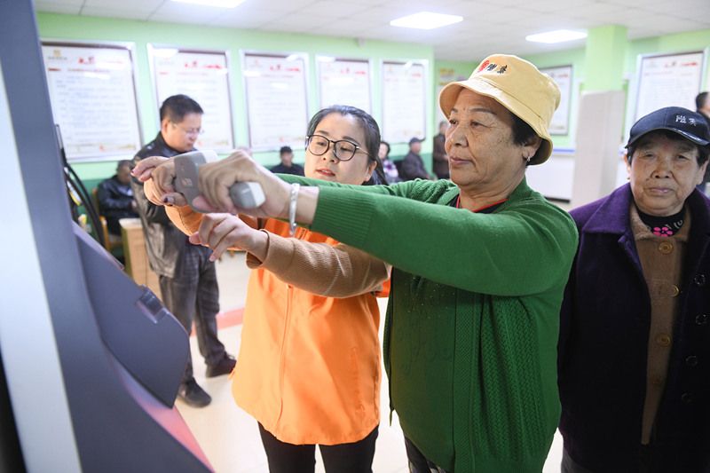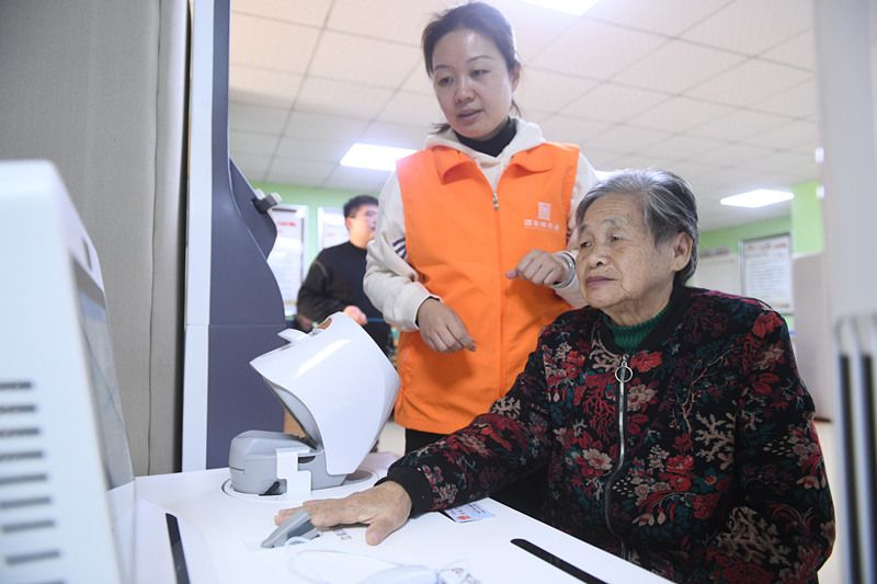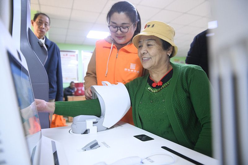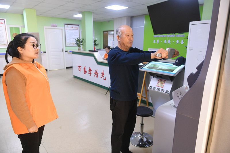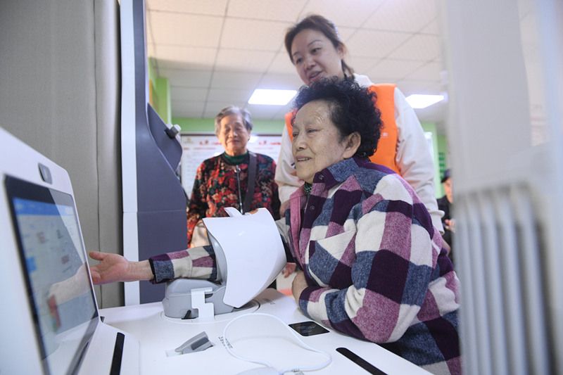 2021年10月22日,在安徽省阜阳市颍州区文峰街道莲池社区日间照料中心智慧健康驿站内,一名老人在工作人员的指导下进行健康体检。