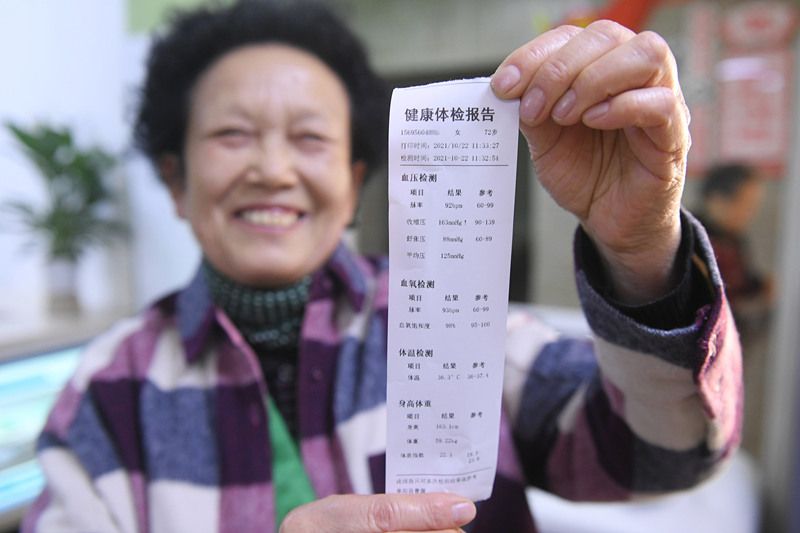 2021年10月22日,在安徽省阜阳市颍州区文峰街道莲池社区日间照料中心智慧健康驿站内,今年72岁的王文英老人展示及时打印出的健康体检报告单。