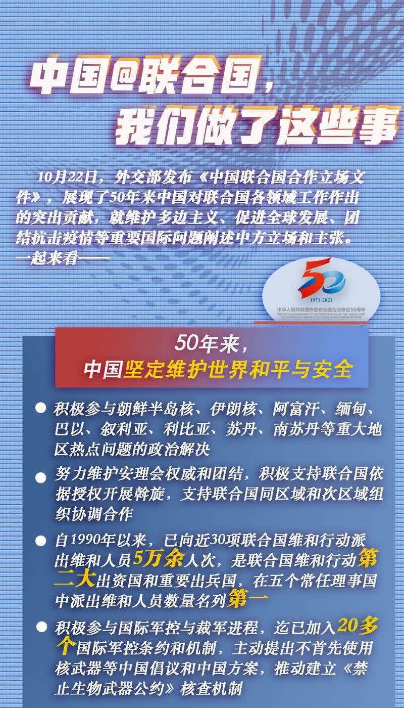 10月22日,外交部发布《中国联合国合作立场文件》,展现了50年来中国对联合国各领域工作作出的突出贡献,就维护多边主义、促进全球发展、团结抗击疫情等重要国际问题阐述中方立场和主张。