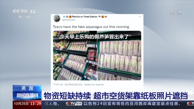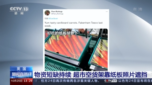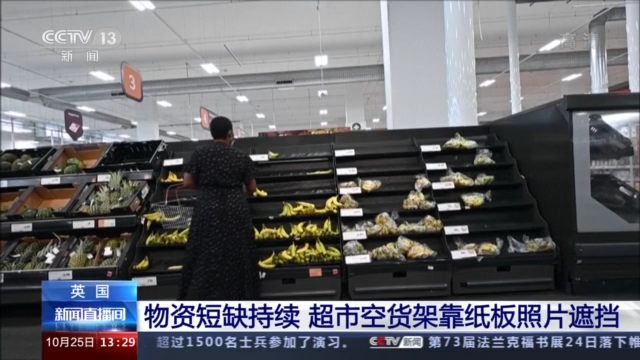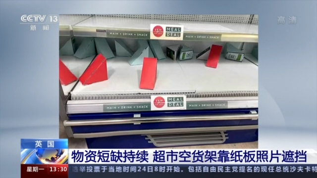 随着英国供应链危机的持续蔓延,英国很多超市陷入了商品短缺的窘境。据英国媒体报道,近日有购物者发现,为遮挡空荡荡的货架,英国多家大型连锁超市将印有蔬菜、水果照片的纸板摆在了缺货的货架上。