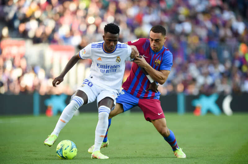 10月24日,巴塞罗那队球员德斯特(右)与皇家马德里队球员维尼修斯在比赛中拼抢。新华社发(古斯塔沃·巴连特摄)