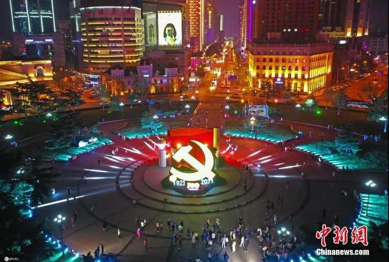 资料图:6月27日,辽宁大连中山广场中央,一枚10米高的金色党徽散发着光芒。图片来源:ICphoto