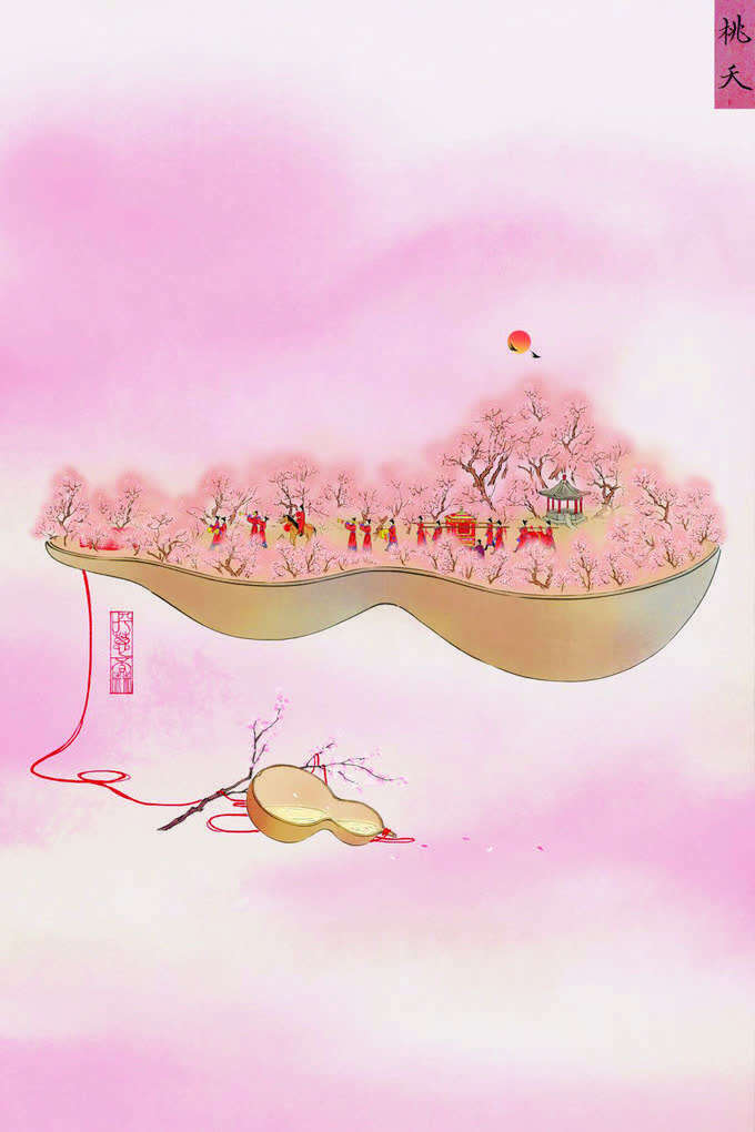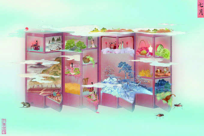 “例如《桃夭》讲的是祝贺新婚,我就以合卺酒为钵,红线的一头装载着婚嫁的队伍,另一头装满美酒;《遵大路》讲的是情人之间苦苦挽留的故事,我选用了破镜难圆的意象;《七月》讲的是一年四季农民伯伯的劳作和艰辛,这首诗内容繁杂,像一个生活长卷。我就选用了多宝格、首饰箱来承载。”