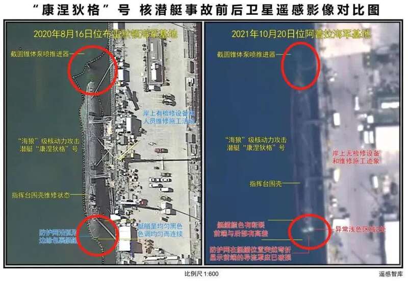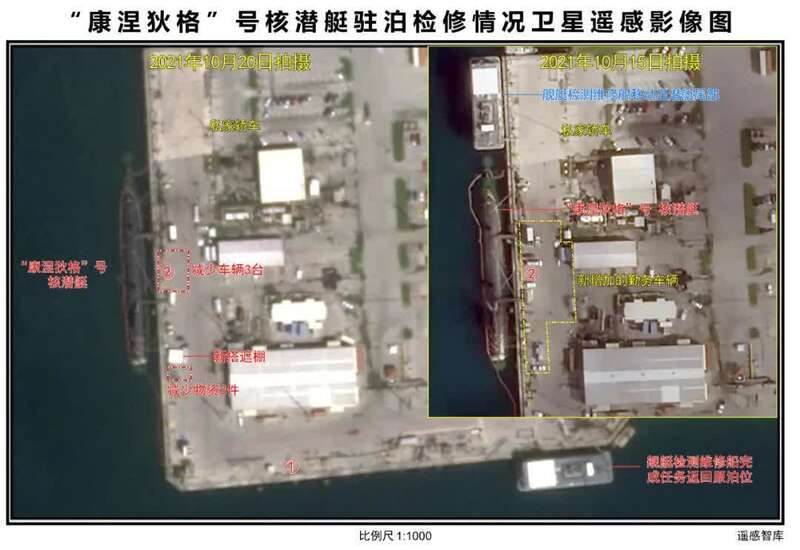 以深度解读遥感图像见长的“遥感智库”利用最新开源卫星影像,采取目标识别、影像分析、信息提取、量化对比等技术手段,对“康涅狄格”号核动力攻击潜艇状态进行判断得出,该艘潜艇艇艏导流罩疑似已严重破损。