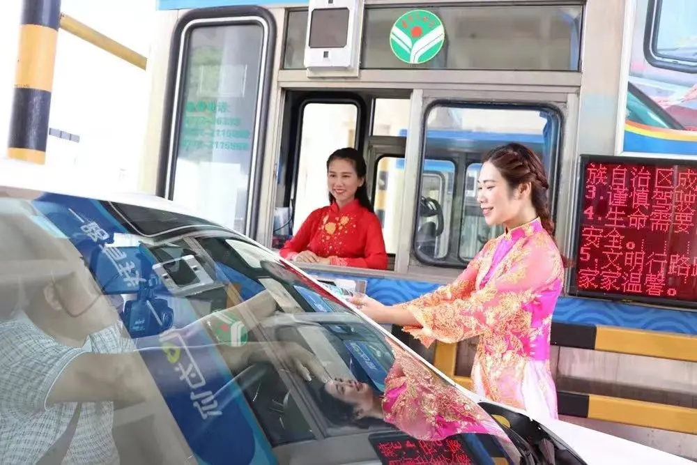 收费站员工在岗位工作之余,多次受邀参加东兴市春晚、京族重大节日“哈节”文艺展演,担任“京族形象大使”迎宾礼仪接待前来参加活动的越南、泰国等国际友人,架起一座文化交流的友谊之桥。