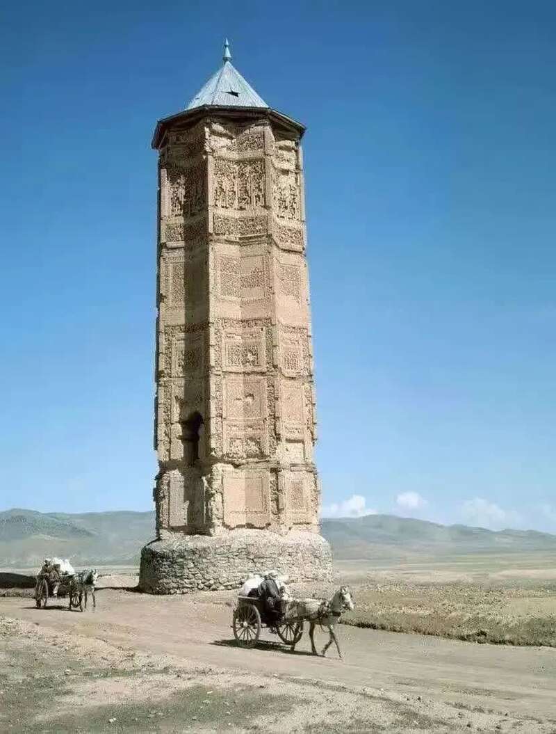 加兹尼以东的马苏德三世宣礼塔(建于12世纪),一对马车正徐徐驶过。拍摄于1950年。