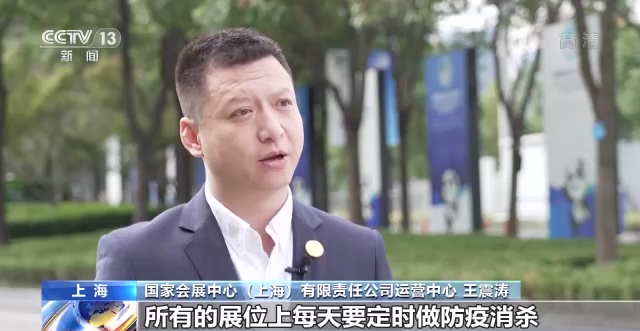 国家会展中心(上海)有限责任公司运营中心 王震涛:在搭建这一块,所有的展位上每天要定时做防疫消杀,每个展位上有一个防疫消杀的记录,要实时监控的。然后我们的环境消杀每天早晨在进馆之前做一个防疫的现场消杀保障,闭馆之后做所有的空气消杀保障,我们其他所有公共区域全是不间断地消杀擦拭。