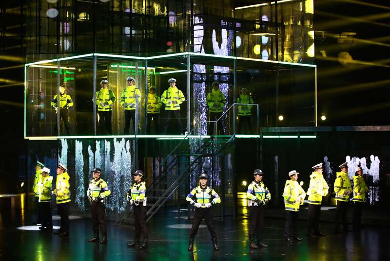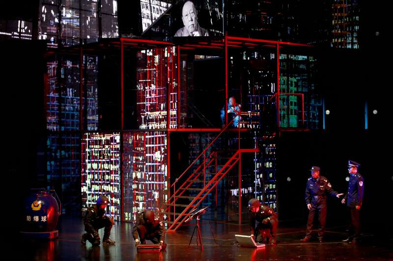 舞台上诸多警种轮番登场,演员刘晶晶率领铁骑交警,为保护人民群众安全形成一道人墙,为这部硬汉戏增添了一抹靓丽的色彩;排爆特警队的成员们在三层舞台结构中穿梭;指挥中心里,信息岗、视频研判岗、法制督察岗等,生动真实地再现了人民警察的日常。