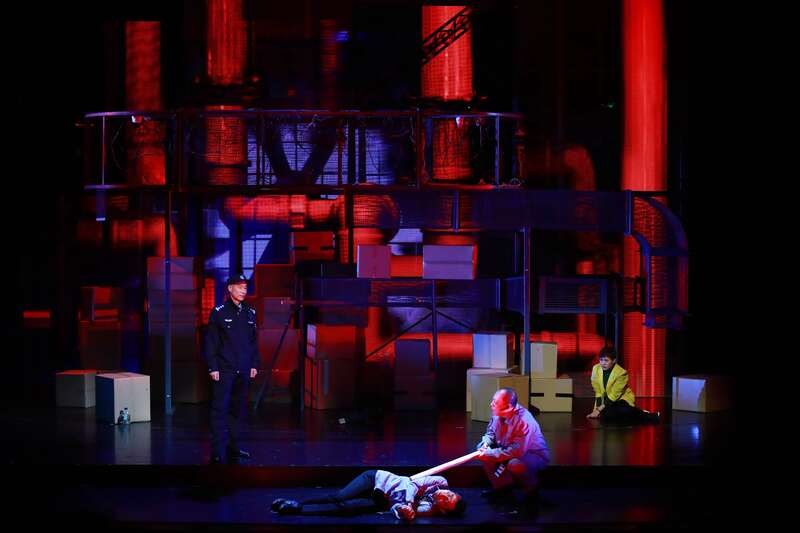 舞美总监刘科栋配合剧中与高科技相关的犯罪情节,将整个舞台打造成了楼体框架结构的九宫格魔方,运用三层转台,变幻出商场、指挥中心、拳击馆、警务室、街道等场景。