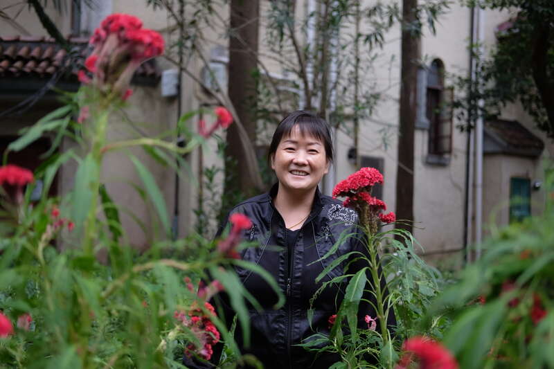 小幼工作的地方有一位清洁阿姨,今年刚刚搬到新华路,听说有这个展览,便欣然答应了填写问卷的邀请,也算是支持年轻人的活动。“她能说的东西不是很多,但她想表达的核心是,她很快乐。她喜欢邓丽君,喜欢花。我们就抓住这个点,在新华路上找了一个有很多花的院子。拍了许多她和花的合影,阿姨笑得特别灿烂,我们也挺开心的。”