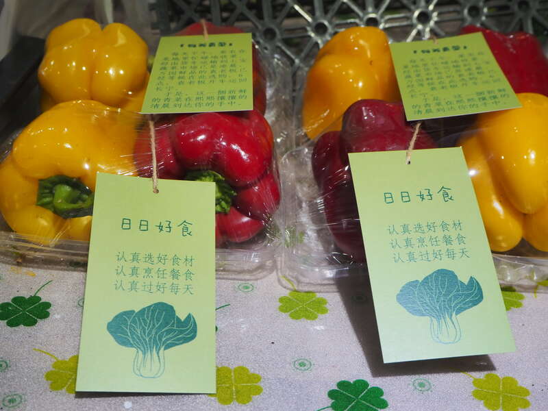 为了摸清店主袁老板的一天是怎么过的,我们吃的这些水果肉菜是怎么来的,“日日好食”的策展团队整整跟了他一天,从深夜的批发市场到日间繁忙的路上奔波,都被拍成了一部纪录片,如今在店中循环播放。而街坊们走到店门口,抬头也能见到店招处悬挂的“袁老板的一天”,在这里购买的水果、蔬菜和肉随着店主袁老板每天凌晨开始的采购程序,路径清晰。这些,都是“日日好食”展览的一部分。