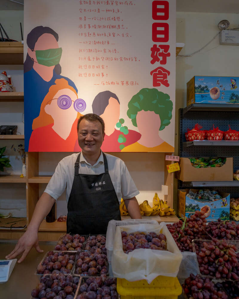 另一位策展人腰三一直在艺术相关行业工作,虽然第一次担任“策展人”的角色,但对展览并不陌生的她坦言:“我对白盒子空间已经厌倦了,这种‘公共艺术’非常有生气,也有真实性。”在大鱼列出的几个参展商户中,她第一时间相中了万园鲜品,因为它是所有商户中“最接地气”的一家。