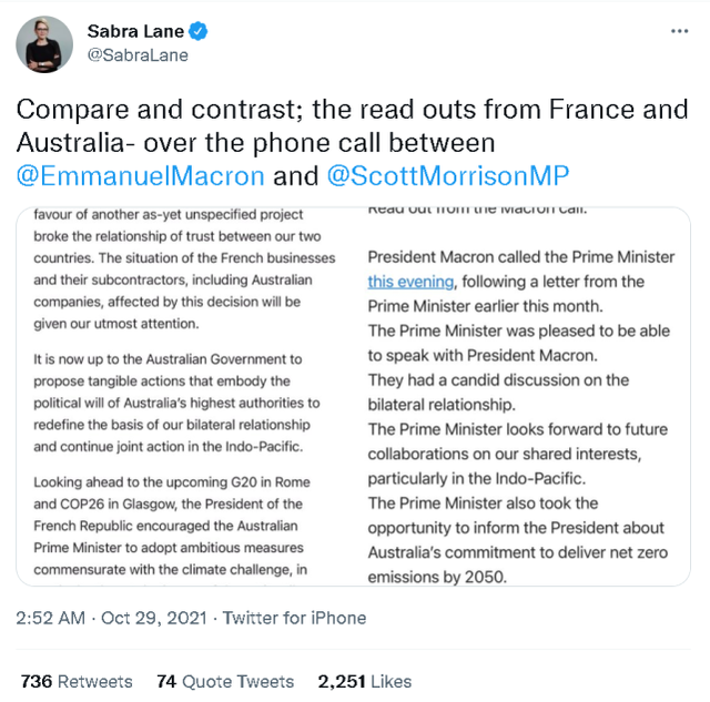 今天凌晨,澳大利亚广播公司的主播Sabra Lane就在她的社交账号上公布了两份莫里森和马克龙的通话记录:一份是澳方发给本国媒体的,一份是法国政府发布的。