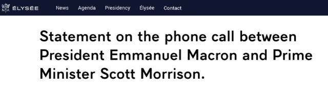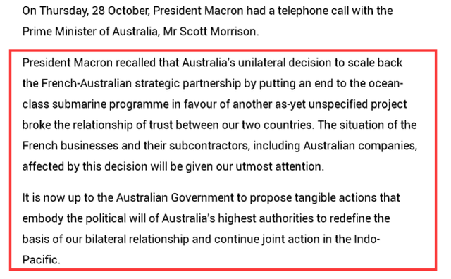 如下图所示,在法国总统府发布的双方通话声明中,法方一上来就再次吐槽了澳大利亚之前在潜艇问题上背叛法国的举动,称这一行为损害了双方的互信和双方企业的利益,并称澳方应该为重新建立起两国在印太地区的合作和双边关系而拿出诚意。