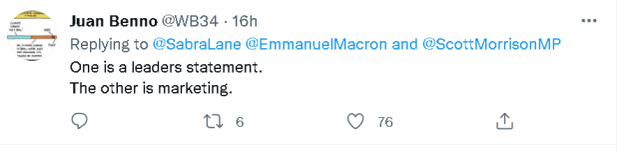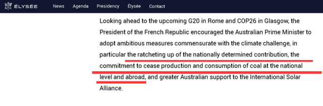 而在涉及气候变化的部分,法方的说法也同样让莫里森颇为难堪,因为从措辞来看,法方似乎是觉得澳大利亚在应对气候变化问题上不应该光有承诺,还应该付诸于行动,并尤其提到了澳方应该致力于减少煤炭的生产和使用。