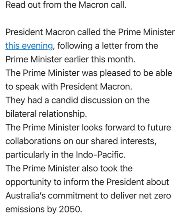其中,澳大利亚政府发布的关于两国领导人通话的声明十分简短,大意是澳方称莫里森总理和马克龙总统就双边关系进行了“坦率”的交流,莫里森“期待”与法方在印度太平洋地区等双方有着共同利益的事务上继续合作。