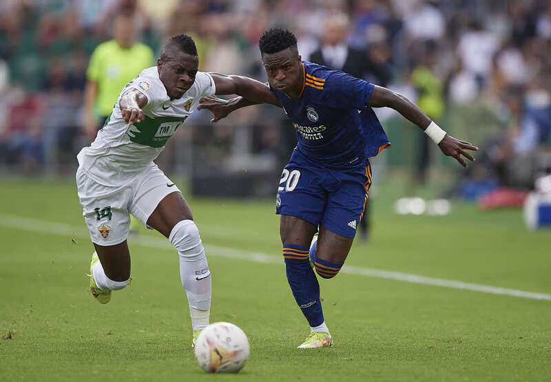 10月30日,皇家马德里队球员维尼修斯(右)与埃尔切队球员帕拉西奥斯在比赛中拼抢。新华社发