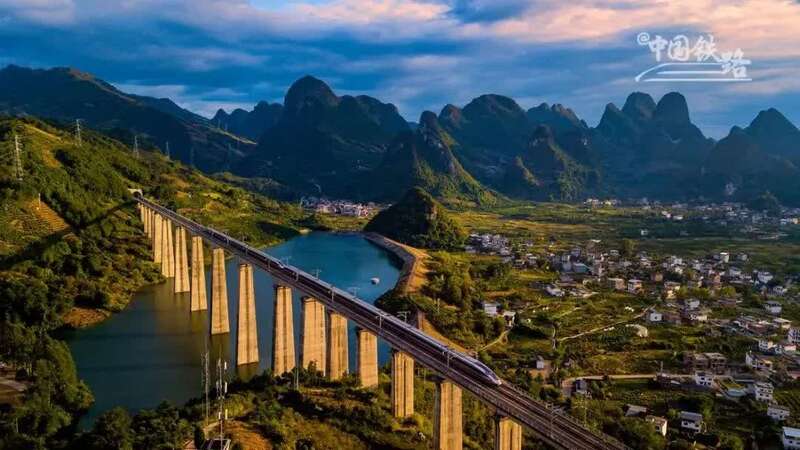 夕阳下的复兴号穿过贵广高铁幸福源大桥,与阳朔山水相映成辉。王峰 摄