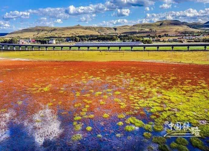 复兴号行驶在乌兰察布市小淖尔湿地。于宝 摄
