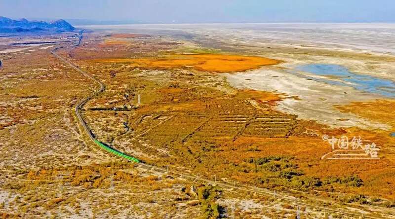 在新疆最大的咸水湖——艾比湖旁,“绿巨人”动车蜿蜒行驶。蔡增乐 摄