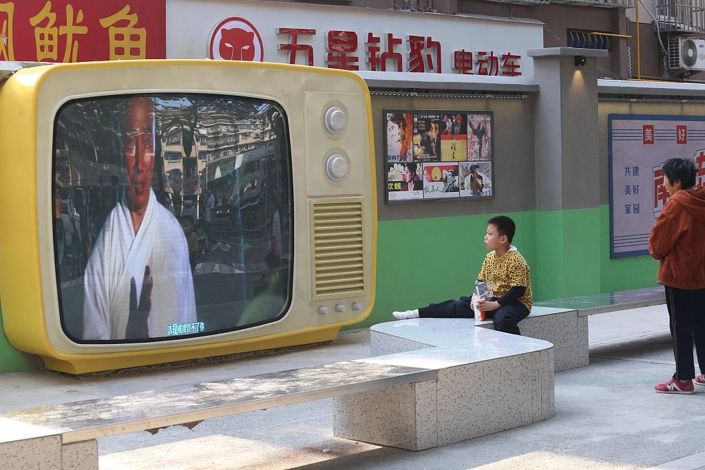 2021年10月31日,南京,南湖东路,双卡录音机、电视机等组成的时代影音展墙、经典影视作品和海报。