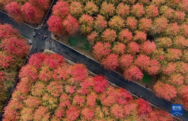 10月31日,人们在山东青岛西海岸新区张家楼街道珠山芝田生态园的千亩枫林里游玩(无人机照片)。