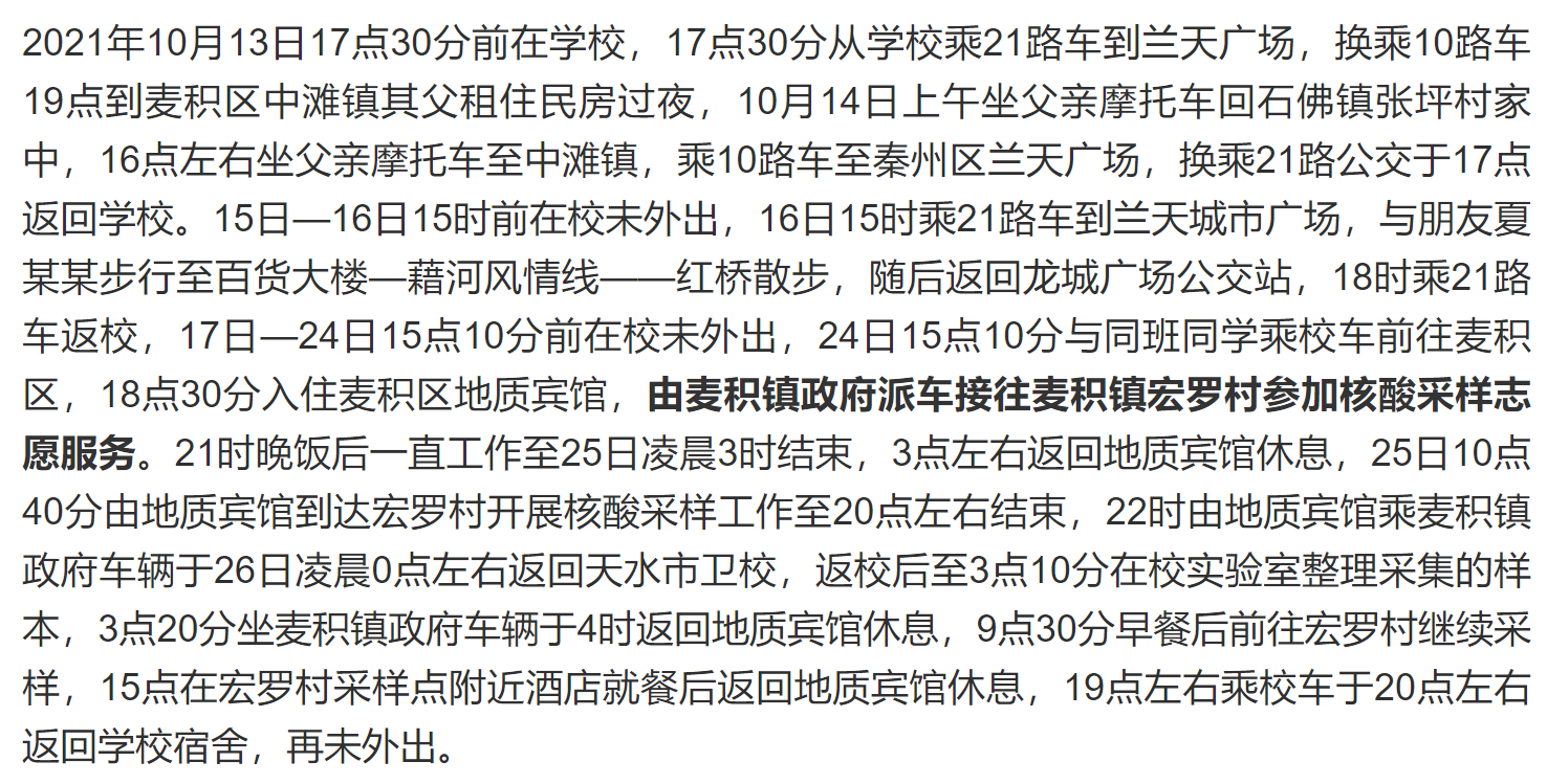10月26日,凌晨零时返回麦积区地质宾馆,12:00午餐后在一楼大厅等候核酸采样,16:00做核酸检测,18:00乘车离开麦积区返回天水市卫生学校。