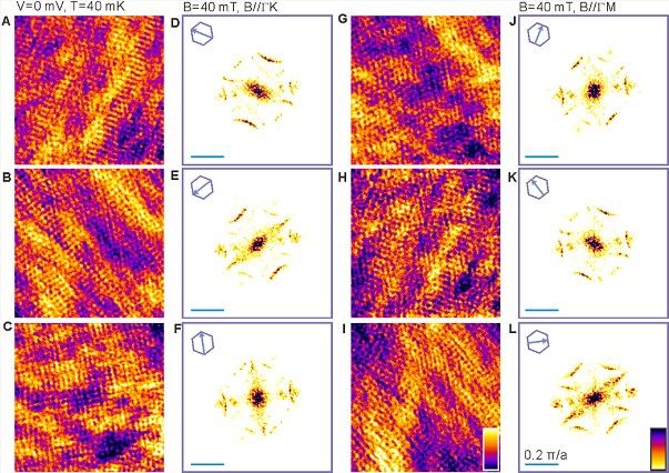 图2, A到C和G到I, 分别沿Γ-K和Γ-M方向施加40mT的磁场后,实空间产生的驻波图案。D到F和J到L,对A到C和G到I进行相应的傅里叶变换,产生与磁场方向依赖的准粒子干涉信号。