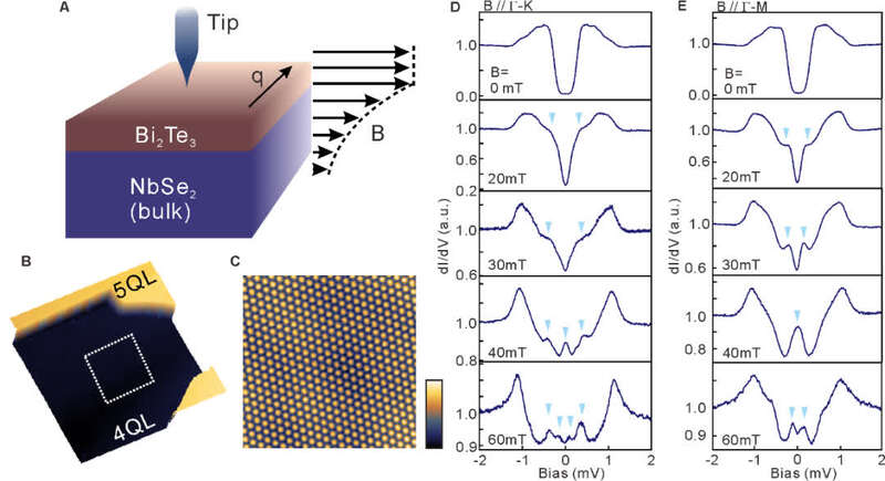 图1. A. Bi2Te3/NbSe2超导异质结示意图。B. 生长在NbSe2衬底上的高质量Bi2Te3薄膜形貌图。C. Bi2Te3薄膜的原子分辨图。D, E. 在不同大小和方向的面内磁场作用下,隧道谱中来源于准粒子的信号逐渐增加。