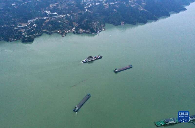 10月31日,船舶行驶在三峡大坝上游湖北省宜昌市秭归县水域(无人机照片)。