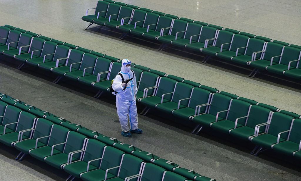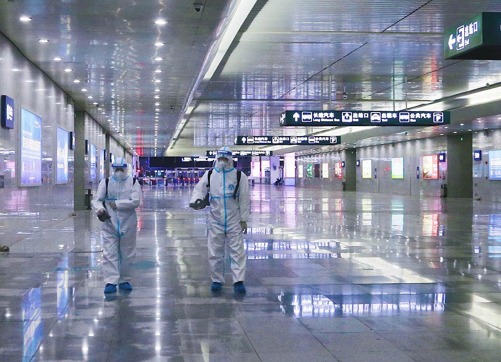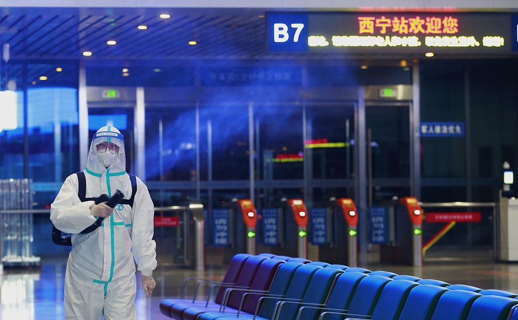 2021年10月30日晚间,防疫人员对青海省西宁市西宁火车站候车大厅进行全面消杀工作。因疫情防控需要,中国铁路青藏集团有限公司铁路疾控中心对西宁火车站候车大厅、检票口、进出站通道、车厢等进行每日两次的全面消杀,确保旅客出行安全。 中新社记者 马铭言 摄