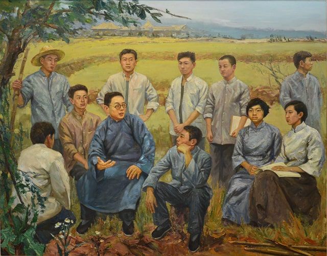 南京晓庄学院教师创作的陶行知与十英烈油画,画中背蹲者为马名驹烈士