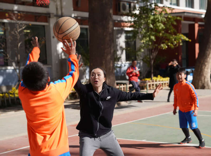 资料图:2018年10月31日,北京师范大学实验小学,中国女篮球员邵婷与小球员“切磋”球技。新华社记者孟永民摄