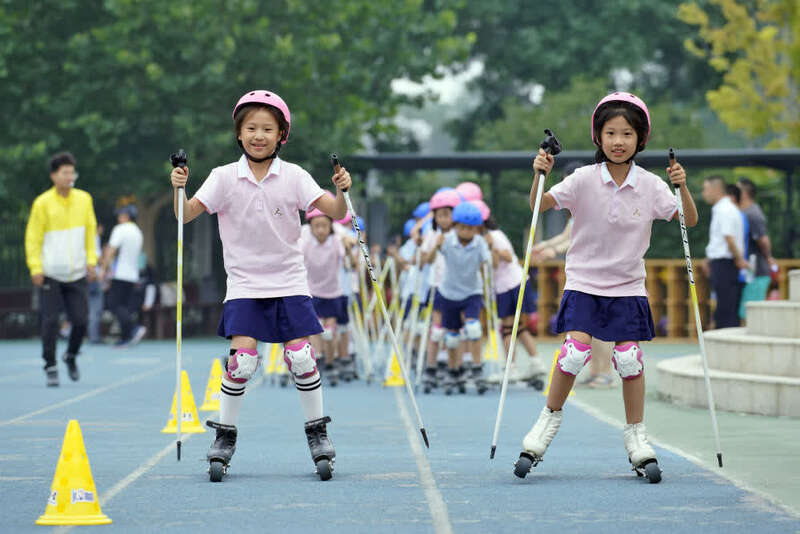 资料图:2019年6月21日,中关村第三小学的学生们在上旱地越野滑雪教学课。新华社记者沈伯韩摄