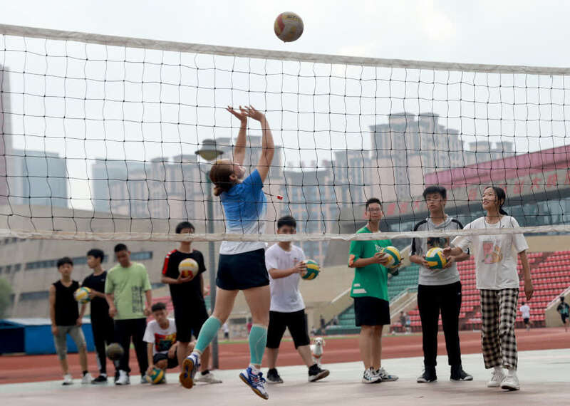7月22日,在华蓥市双河第二中学,老师在为学生示范排球动作。暑假期间,四川省华蓥市在部分学校试点开办体育托管班,免费培训中小学生。新华社发(周松林 摄)
