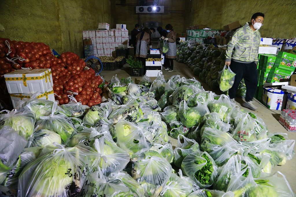 2021年11月1日,西宁市一防疫管控小区,防疫人员将蔬菜卸车清点数量。 中新社记者 马铭言 摄