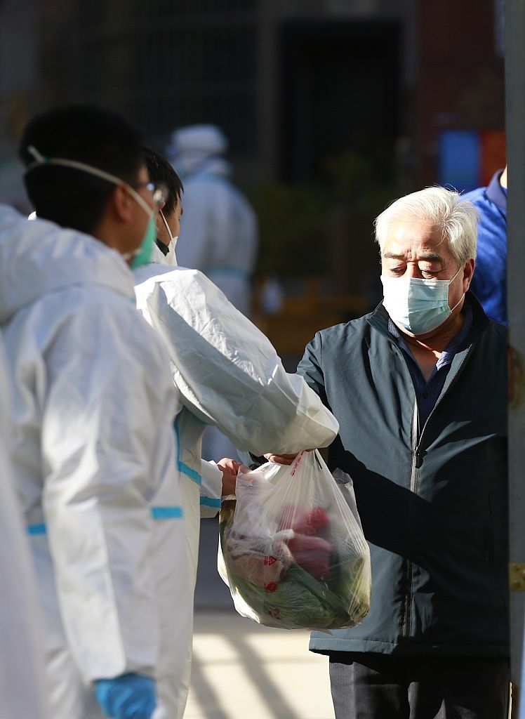 2021年11月1日,西宁市一防疫管控小区,防疫人员将免费蔬菜送至居民手中。 中新社记者 马铭言 摄