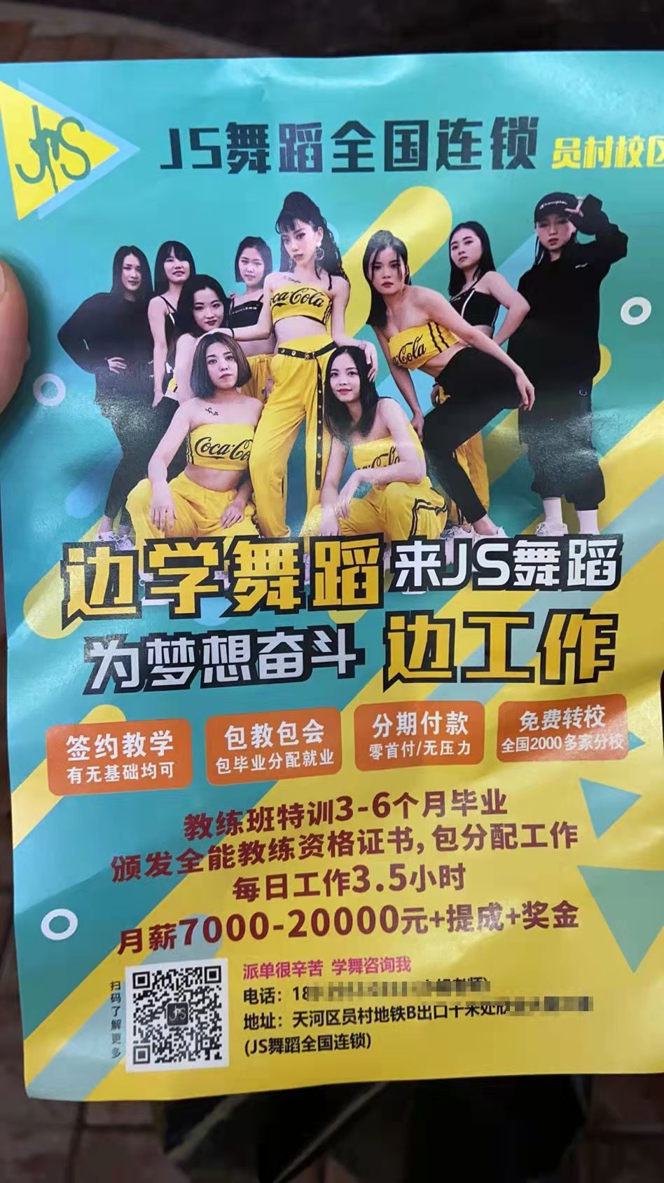 多名自称正在维权的网友告诉澎湃新闻,JS舞蹈在广州、东莞、佛山等地的分店,其宣传文案大同小异,均称教练班可提供全能教练资格证书,并包分配高薪工作岗位。他们正是被JS舞蹈“高薪就业”的承诺所吸引,从而报名。