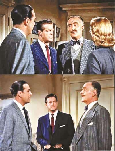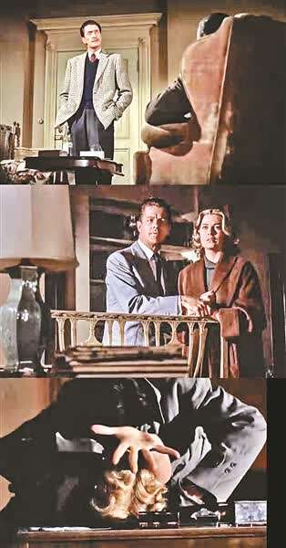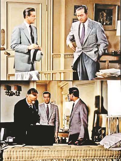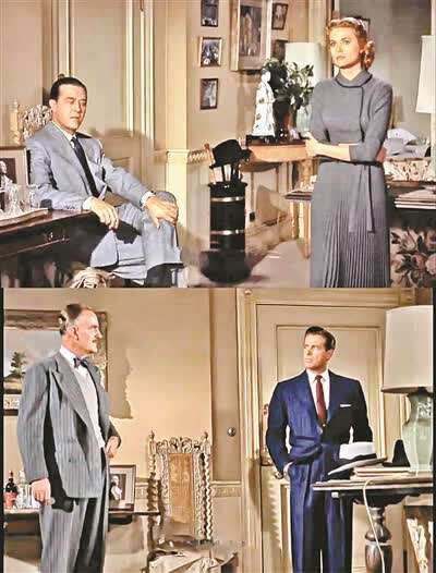 拍《电话谋杀案》,希区柯克再次转回拍彩色片,他对颜色很注重。“比如(图①)这张图里面,三个人穿灰色衣服,一个人穿深蓝色衣服,这个穿深蓝色衣服的人就是玛戈的情夫马克,三个人穿灰色衣服就是汤尼和玛戈夫妇以及探长,只有马克一个人穿深蓝色衣服,在这群人中显得很突兀和尴尬,没办法插入这个所谓的家庭里面,所以是很明显的颜色变调。”