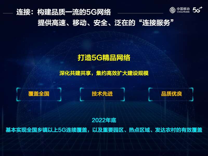 中国青年报客户端讯(中青报·中青网记者 先藕洁)11月2日,记者从中国移动获悉,在2021中国移动全球合作伙伴大会主论坛上,中国移动董事长杨杰表示,“将全力打造覆盖全国、技术先进、品质优良的5G精品网络,确保2022年底前基本实现全国乡镇以上5G连续覆盖,以及重要园区、热点区域、发达农村的有效覆盖。”