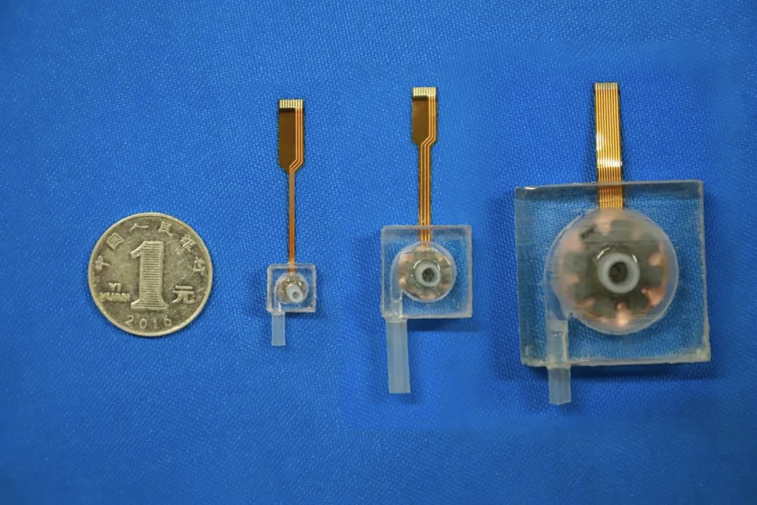 柔性磁悬浮微型离心泵主要由 柔性磁性转子、蜗壳型腔室、磁束缚环和柔性控制电路 四大部分组成。柔性磁悬浮微型离心泵通过独特的磁悬浮设计,通过磁束缚环将磁性转子以磁悬浮的方式稳定于蜗壳型腔室中,避免了磁性转子与蜗壳腔室摩擦接触造成的旋转阻碍和能量损耗; 通过三相线圈和柔性控制电路控制磁性转子在液体环境中高速旋转,从而实现液体泵流。 针对不同的应用场景,黄显团队研发了体积从0.3 ~11.7 cm3,质量从0.3-12.8g不同的离心泵系统。该泵突破了柔性磁性转动结构设计和制备技术、磁性薄膜的磁束缚技术和转动薄膜的测试表征技术。柔性泵的最大的体积和重量仅为现有刚性离心泵的1/20。