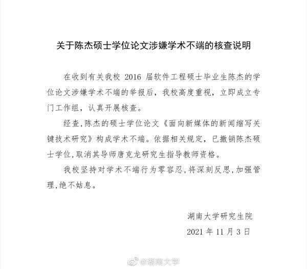 澎湃新闻注意到,11月3日23时59分,湖南大学在官方微博上回应称,收到相关举报后立即成立了专门工作组,认真开展核查。经查,陈杰的硕士学位论文《面向新媒体的新闻缩写关键技术研究》构成学术不端。依据相关规定,已撤销陈杰硕士学位,取消其导师唐克龙研究生指导教师资格。