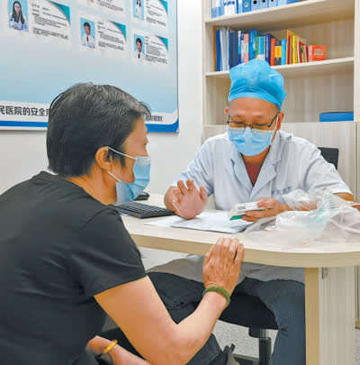 在广东省深圳市罗湖区翠竹街道社康中心药师门诊,一名慢性病患者正在向药师咨询有关用药事宜。