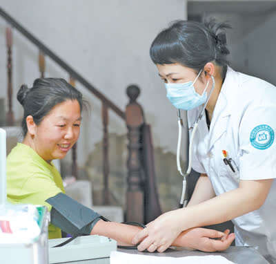 在浙江省台州市椒江区洪家社区一名慢性病患者家里,社区卫生服务中心蔡海红医生正在为患者开展上门随访服务。