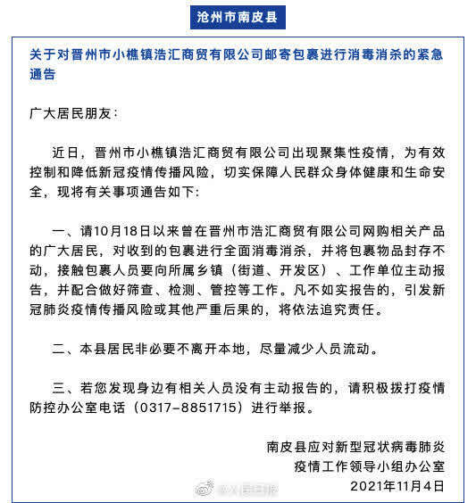 近日,由于河北晋州市小樵镇浩汇商贸有限公司出现聚集性疫情,河北7地发布紧急通告,要求10月18日以来曾在该公司网购相关产品的市民,对收到的包裹进行全面消杀,并将物品封存不动,接触包裹人员要主动报告。扩散,自查!