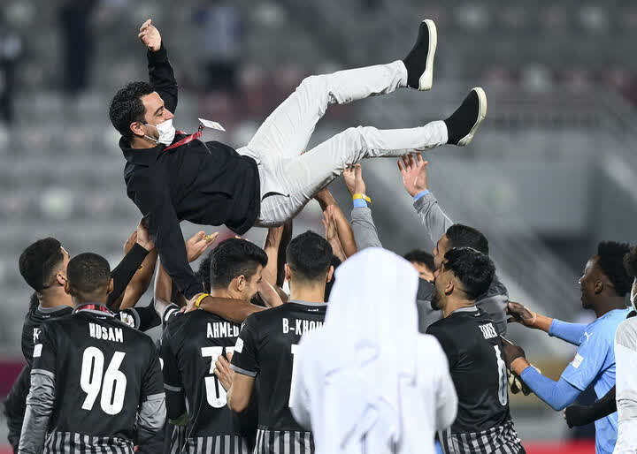 2月26日,在卡塔尔首都多哈进行的2021年卡塔尔杯足球赛决赛中,阿尔萨德队以2比0战胜阿尔杜海勒队,夺得冠军。阿尔萨德队主教练哈维(上)在比赛后被球员抛向空中。新华社发(尼库摄)