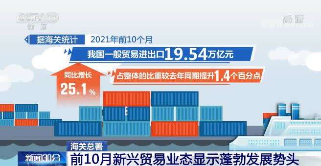 据海关统计,今年前10个月,我国一般贸易进出口19.54万亿元,同比增长25.1%,占整体的比重较去年同期提升1.4个百分点。同时,我国跨境电商、市场采购贸易等新兴贸易业态也显示出蓬勃发展势头,贸易方式结构进一步优化。