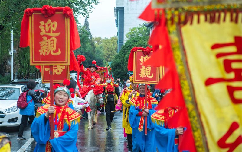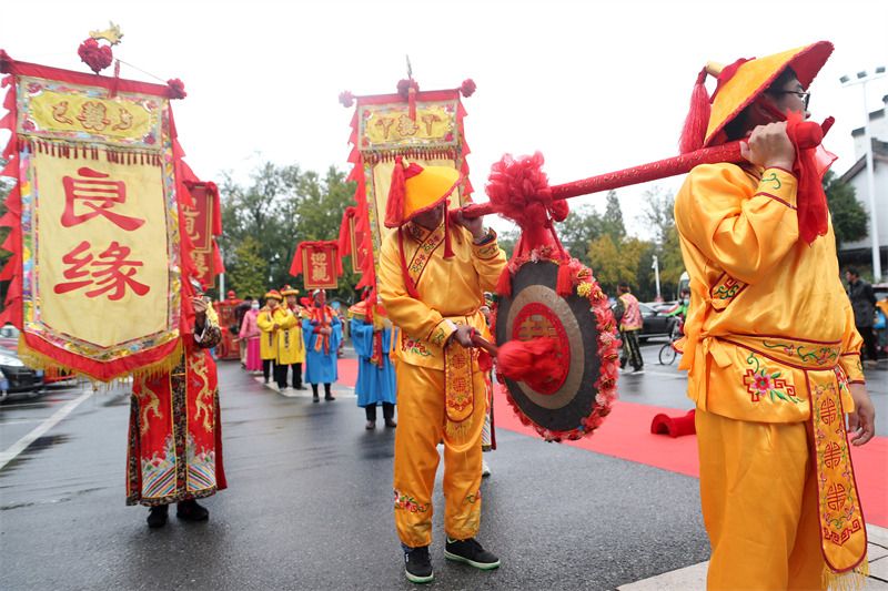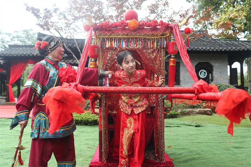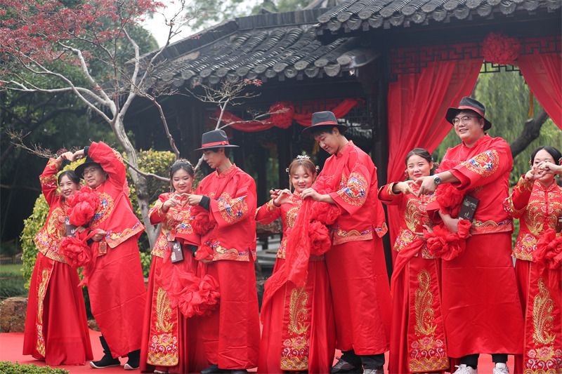2021年11月6日,江苏扬州,“喜运个园-2021盐商体验式婚礼”举行,六对情侣在广大市民和游客的见证下,从御马头登船,在个园码头上岸进入景区,携手“穿越两百年”,体验了清代扬州盐商婚礼的全套流程。